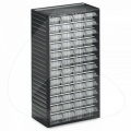 A tároló szürke (RAL7016) vázát erős polipropilénből, fiókjait víztiszta porisztirolból állítják elő.